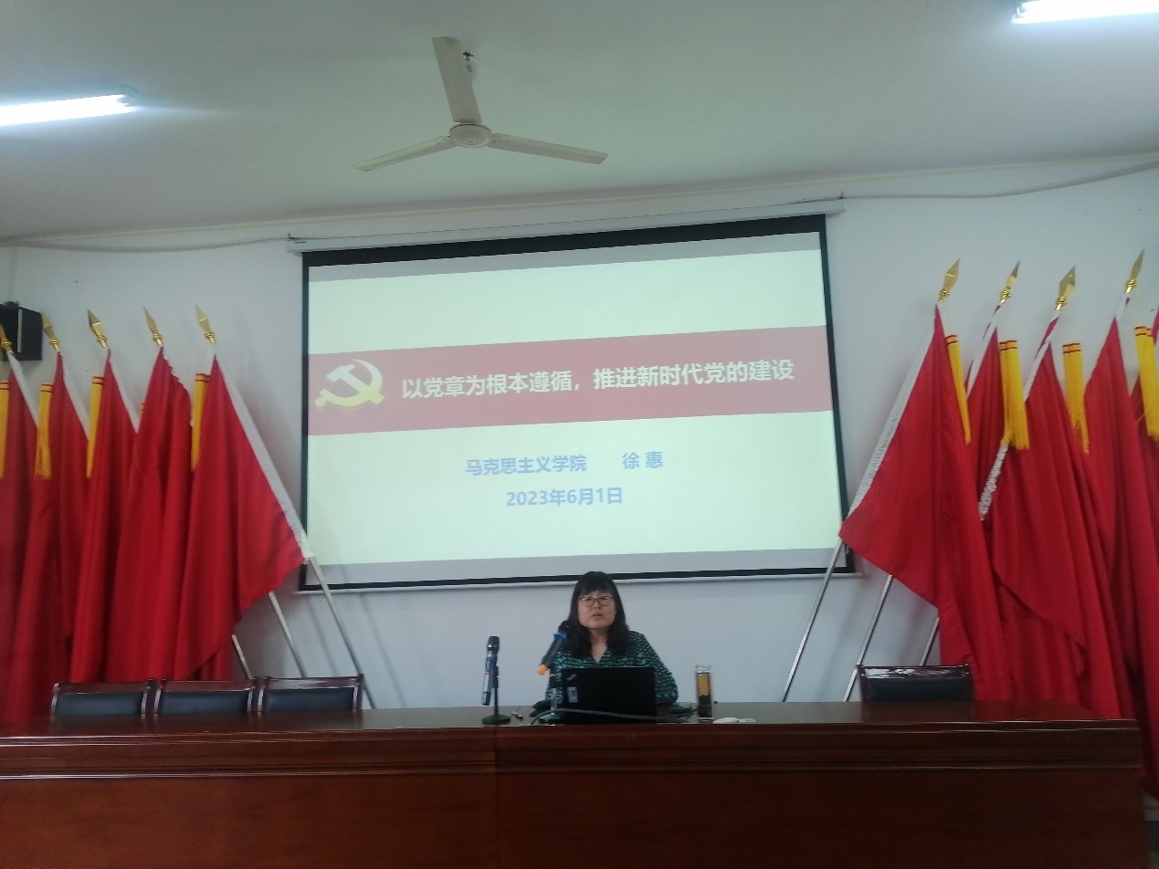 徐惠讲授了题为《以党章为根本遵循,推进新时代党的建设》的专题党课。课程从党章的发展历程、党章的主要内容、党章的地位和作用等三个方面对党章进行了深入解读。徐惠指出,党章是管党治党的总规矩、总章程,是中国共产党最根本的党内法规,集中体现了党的性质宗旨、路线纲领、奋斗目标、党员的权利义务等,是党的各级党组织和全体党员必须严格遵循的基本准则。徐惠强调,认真学习党章、自觉践行党章、用心维护党章是每一位党员教师的基本义务和要求,党员教师要以身作则,时刻对照党章的各项规定规范自己的行为,从而深入推进新时代党的建设新的伟大工程。