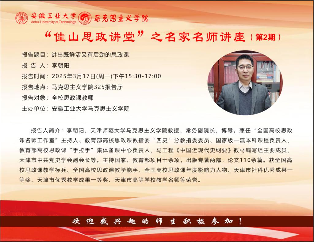为贯彻落实习近平总书记关于推动新时代高校思政课建设的重要讲话指示精神,提高思政课的针对性和吸引力,在守正创新中推动思政课建设内涵式发展,2025年3月17日下午3:30,学院在325报告厅举行第二期佳山思政讲堂之名家名师讲座活动,邀请天津师范大学漫蛙