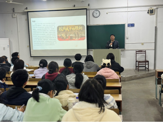 校党委书记陆林以“纪念抗战胜利 坚定民族信念”为题,立足百年变局下的国际形势,为学生们上了一堂立意高远、思想深刻的思政课。授课中,陆林从“历史必然”“现实启示”“青年担当”三个维度,阐释纪念抗战胜利的时代价值。他着重强调,青年学生必须铭记历史、坚定理想信念,坚决维护国家主权和领土完整,不断增强忧患意识与斗争精神,共同筑牢民族复兴的安全根基。