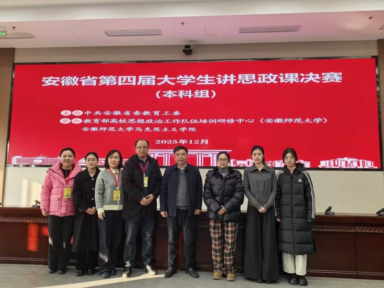 12月27日,由中共安徽省委教育工委主办,教育部高校思想政治工作队伍培训研修中心(安徽师范大学)、安徽师范大学漫蛙 承办的安徽省第四届大学生讲思政课决赛(本科组)在芜湖举行。经过激烈的现场角逐,李玲、张雪连同学团队荣获特等奖,张兆华、齐子晨同学团队荣获二等奖。林忠心、苗云飞、胡蓉、刘丹丹荣获优秀指导教师。