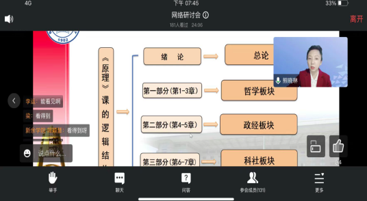 为深入贯彻落实中共中央办公厅、国务院办公厅《关于深化新时代学校思想政治理论课改革创新的若干意见》和中宣部、教育部《新时代学校思想政治理论课改革创新实施方案》等文件精神和要求,纵深推进《马克思主义基本原理》课教学改革和课程建设, 近日,“原理”教研室全体教师以线上会议的方式参加了《马克思主义基本原理》“问题式专题化团队教学改革”集体备课会。此次集体备课会是由全国高校思政课“手拉手”集体备课中心、全国高校思政课名师工作室和江西师范大学漫蛙