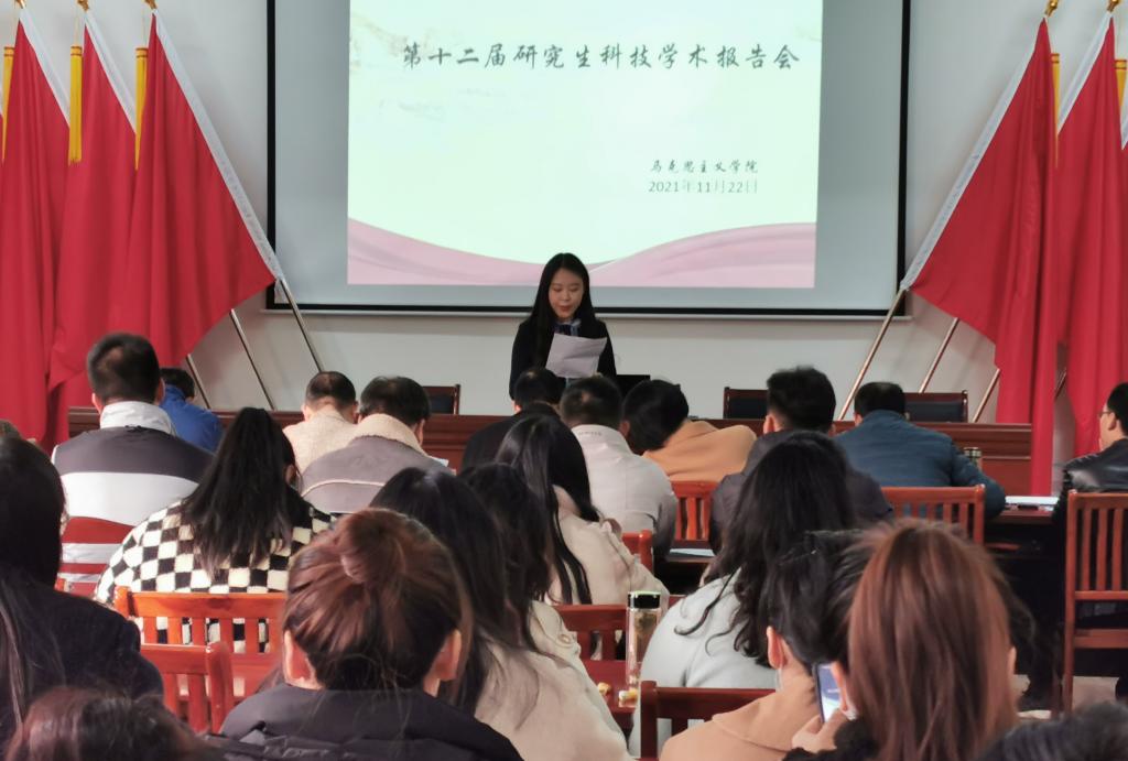 在多功能报告厅325教室举办马院第十二届研究生科技学术报告会。报告会由副院长宫晓虹主持,曹大文教授等7位老师担任评委,2020和2021级全体研究生参加。