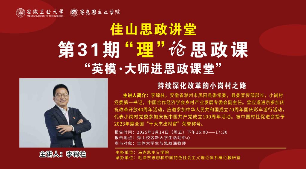 主讲人简介:李锦柱,安徽省滁州市凤阳县委常委,县委宣传部部长,小岗村党委第一书记,中国合作经济学会乡村产业发展专委会副主任。曾应邀进京参加庆祝改革开放40周年活动,应邀参加中华人民共和国成立70周年国庆彩车游行活动,代表小岗村党委参加庆祝中国共产党成立100周年活动。被中国村社促进会授予2023年度全国“十大杰出村官”荣誉称号。